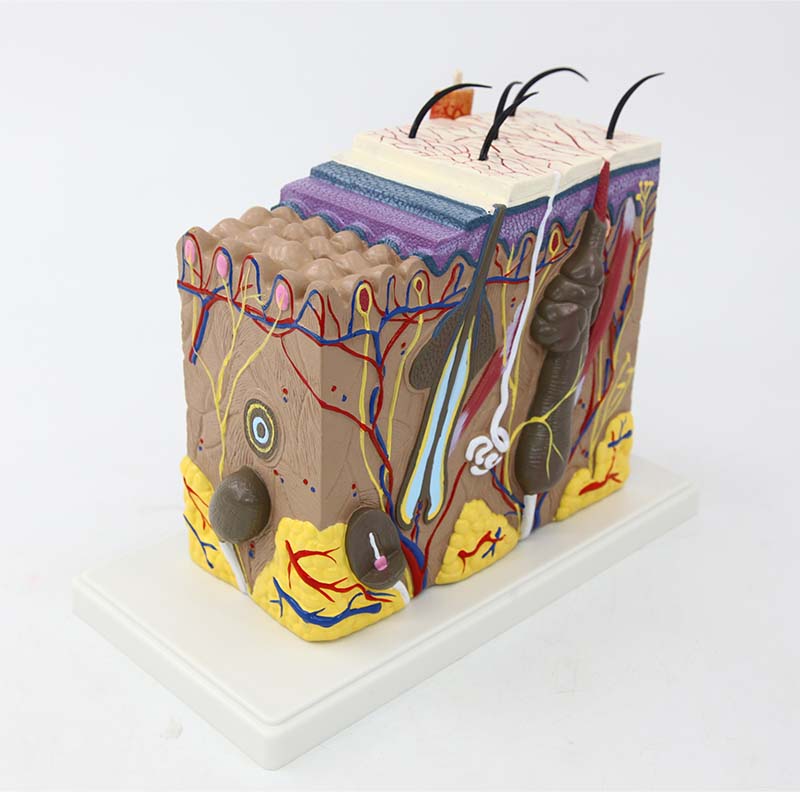皮膚結構模型放大展示人體皮膚完整層次結構,清晰呈現表皮、真皮、皮下組織,以及毛發、毛囊、皮脂腺、汗腺、血管、神經等附屬結構。層次分明、標識清晰,直觀體現皮膚保護、分泌、排泄、感受等功能,適用于生物、醫學、美容教學及科普展示。