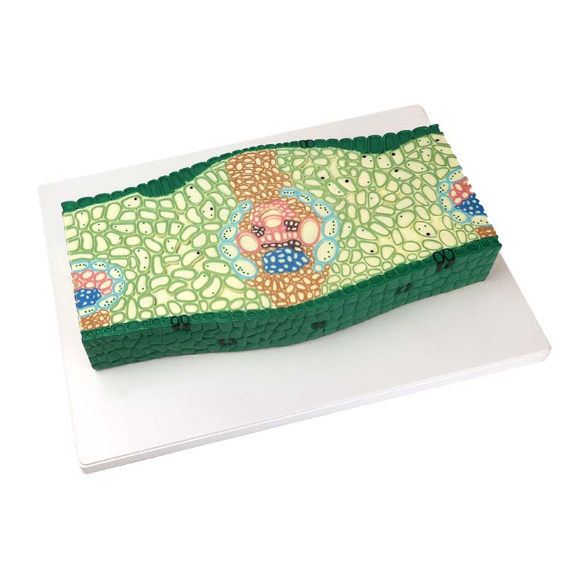 本模型清晰展示葉片的橫切面結構,包括上表皮、下表皮、柵欄組織、海綿組織、葉脈、氣孔、保衛細胞等構造,直觀呈現葉片光合作用、氣體交換的結構基礎,形態標準、標識清晰,適用于中小學生物課堂教學與植物科普演示。