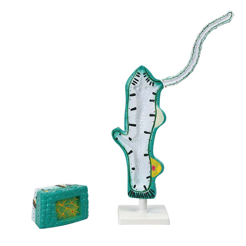 本模型展示水螅的外部形態與內部解剖結構,清晰呈現外胚層、內胚層、中膠層、觸手、刺細胞、口、消化循環腔及芽體等構造,直觀體現腔腸動物輻射對稱、兩胚層、有口無肛門的特征,適用于中小學生物課堂教學與動物演化科普演示。