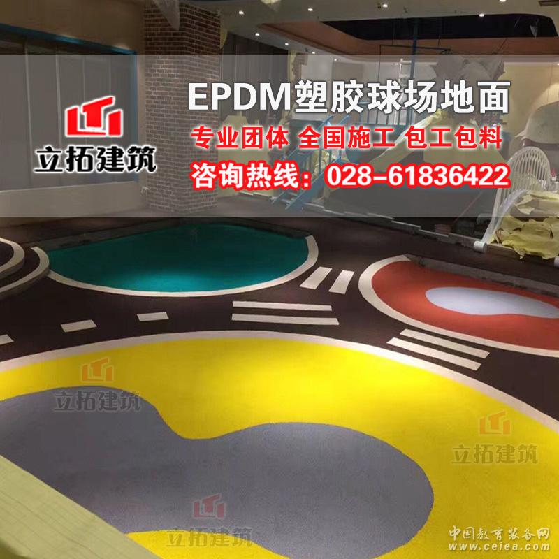EPDM球場由高強度、高彈性、強抗紫外線的EPDM顆粒拌和一定比例的單組份膠水,在混凝土或瀝青基礎上直接攤鋪、壓實而成。具有長時間的使用壽命,彈性程度及動力學設計特征。底層由聚氨酯黏合劑按控制比例混合特殊膠粒后,經由專業施工機械控制厚度鋪設。是PU球場的替代產品,具有施工方便,對基礎適應能力強,不容易起皮、起泡等優點。