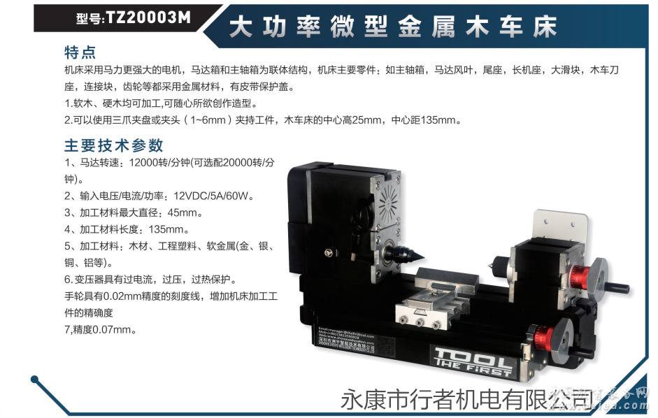 產(chǎn)品詳細(xì)介紹木車床特點(diǎn):機(jī)床采用馬力更強(qiáng)大的電機(jī),馬達(dá)箱和主軸箱為聯(lián)體結(jié)構(gòu),機(jī)床主要零件:如主軸箱,馬達(dá)風(fēng)葉,尾座,長機(jī)座,大滑塊,木車刀座,連接塊,齒輪等都采用金屬材料,有皮帶保護(hù)蓋。 1.軟木、硬木均可加工,可隨心所欲創(chuàng)作造型。 2.可以使用三爪夾盤或夾頭(1~6mm)夾持工件,木車床的中心高25mm,中心距135mm。 技術(shù)參數(shù): 1、馬達(dá)轉(zhuǎn)速:12000轉(zhuǎn)/分鐘(可選配20000轉(zhuǎn)/分鐘)。 2、輸入電壓/電流/功率:12VDC/5A/60W。 3、加工材料最大直徑:45mm。 4、加工材料長度:135mm。 5、加工材料:木材、工程塑料、軟金屬(金、銀、銅、鋁等)。 6. 變壓器具有過電流,過壓,過熱保護(hù)。 手輪具有0.02mm精度的刻度線,增加機(jī)床加工工件的精確度 7,精度0.07mm。 |