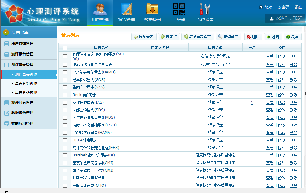 產品詳細介紹124個權威量表 1、測評環境多樣化:本心理測評系統可適用于單機、局域網、互聯網等多種網絡環境。 2、測評平臺多樣化:本心理測評系統可同時適用于PC電腦、平板電腦(需要WIFI支持)、觸摸互動一體機等多種應用平臺。 3、分級管理功能:本心理測評系統實現三級管理功能。即,實現單位、部門、患者的三級聯動管理。 4、測評過程自動化:本心理測評系統測試過程自動化,無需人工計分,系統自動保存和實時處理分析測試結果,形成測評報告和心理檔案。 5、統計分析功能:強大的統計分析功能,既可以對整體數據進行統計,也可以分科室和量表進行單獨統計;或以男女性別、年齡等進行數據統計。結果使用表格和圖形描述分析,直觀生動。所有測試的原始答案、原始分數和標準分數均可導出到Excel或Word,既便于進一步的專業統計分析,也可進行數據歸檔。 6、數據查詢功能:高效的數據查詢功能,心理咨詢師根據實際工作需要,通過任何查詢條件都可以方便的查詢到自己需要的個體檔案。 7、測評報告生成多樣化:查看個人測評報告、查看團體測評報告以及查看任意組合數據的報告,并可將測評報告導出為Excel或Word等多種格式。 8、智能心理預警系統:通過預警系統可以篩查出有嚴重心理問題的人員,輔導人員可以做相應的指導和干預,做到盡早發現盡早治療。 9、高效的檔案管理功能:可以批量導入測評用戶信息,也可以手工添加詳細測評用戶信息,建立測評用戶的基本檔案;當用戶測評結束以后,系統里面每個測評用戶的信息都包括了個人資料、測評結果等。 10、心理輔導功能:心理咨詢師可以根據用戶測評的結果中的說明及指導意見,對其心理問題進行進一步的輔導治療。 |