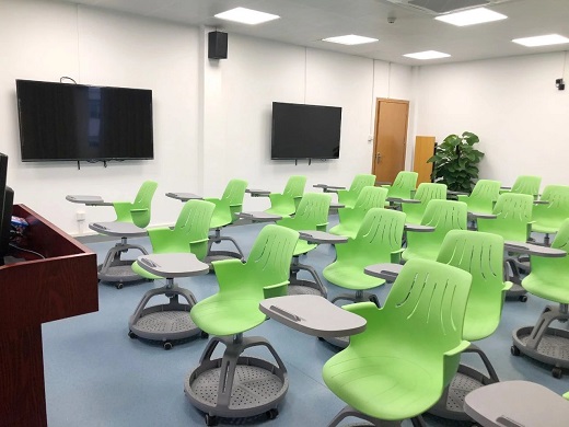 教室前方兩個拼接大屏和兩個顯示屏,在左右兩邊分別設(shè)有3個小組顯示屏。課桌椅接可自由移動和拼接,可分排分列布置或環(huán)繞形成小組。