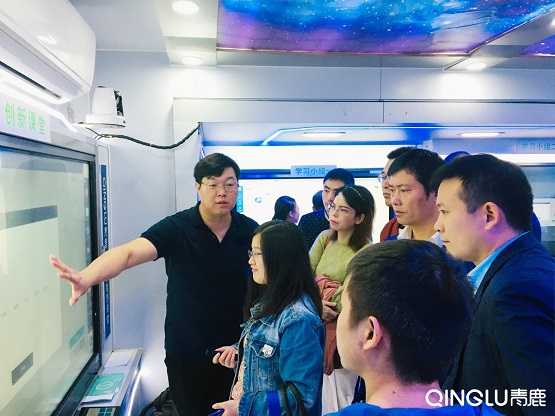 相關(guān)工作人員向師生展示青鹿空中智慧課堂的功能應(yīng)用