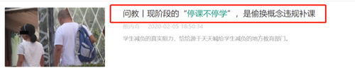 作為家長,我們最關注的還是孩子的學習狀態和成績。在疫情剛爆發那段時間,我關注到一些學校組織老師錄課,讓學生在家里看教學視頻或者直播,網上對此的負面評價頗多。而且我身邊也有一些同事、朋友也跟我吐槽:‘在家一邊辦公,一邊看孩子有沒有認真上課,還要給孩子拍照打卡,不然就要在家長群里被@,真是太難了。’
