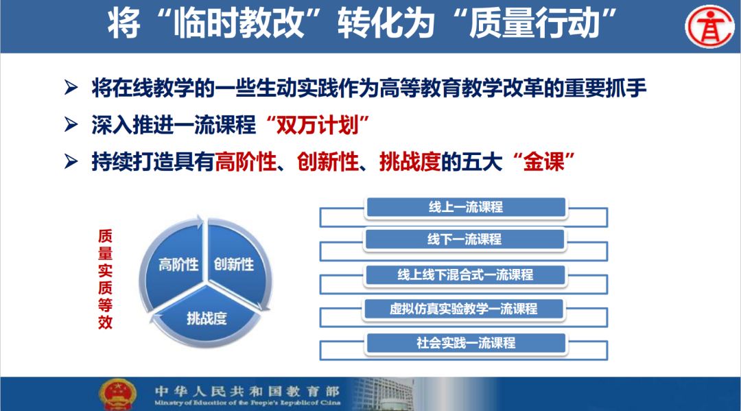 【摘要】近期部分高校開學復課,“金課”建設再次提上日程。當前期間的線上教學能經驗能為“金課”建設提供哪些幫助?混合式教學對比傳統教學又有哪些優勢?