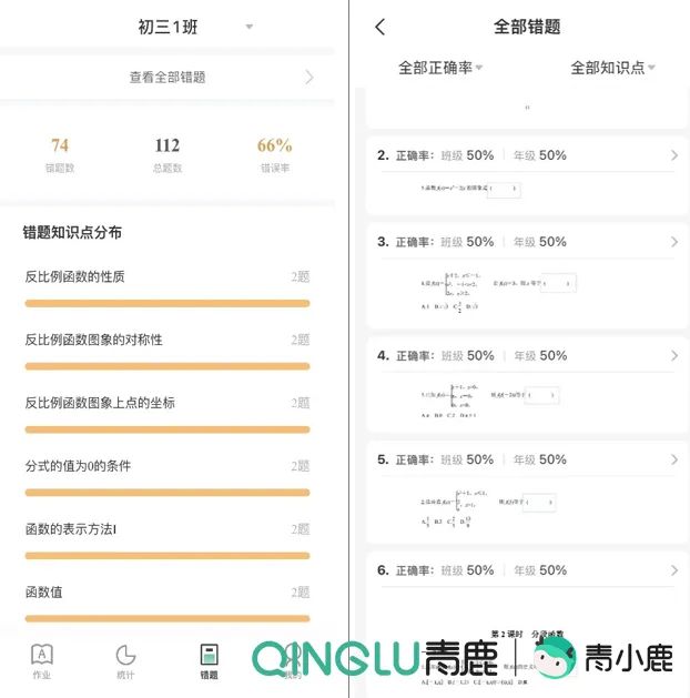 通過采用信息化技術的青小鹿智慧作業(yè),教師無需自行歸納統(tǒng)計,便能快速獲取到各班級的錯題,減少在重復、機械工作上的投入,可將精力聚焦在錯題分析與改題訓練上。