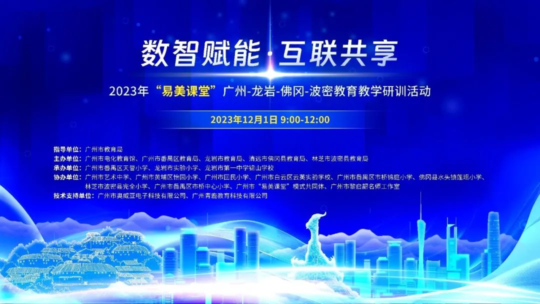 近日,2023年“易美課堂”廣州-龍巖-佛岡-波密教育教學研訓活動在廣州市番禺區(qū)天譽小學、龍巖市實驗小學、龍巖市第一中學錦山學校三個會場同步舉行。本次活動由廣州市教育局指導,廣州市電化教育館、廣州市番禺區(qū)教育局、福建省龍巖市教育局、清遠市佛岡縣教育局、林芝市波密縣教育局聯(lián)合主辦。廣州青鹿教育科技有限公司作為本次活動的技術支持單位。