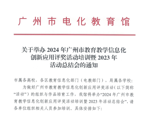 近日,2024年廣州市教育教學(xué)信息化創(chuàng)新應(yīng)用評(píng)獎(jiǎng)活動(dòng)培訓(xùn)暨2023年活動(dòng)總結(jié)會(huì)在廣州市電化教育館順利舉行。