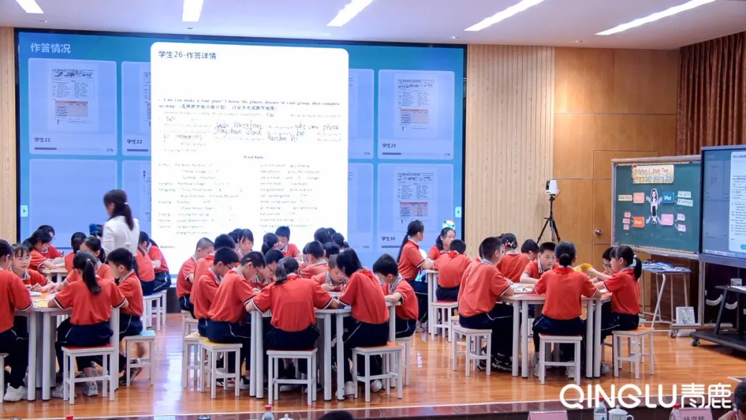 活動采取線上線下相結合方式,分為北苑小學“一評三立”成果展示、研討課例、專題匯報、專家點評、研討沙龍五項進程,蓬江區小學主管教學工作的副校長、教導主任,江門市基礎教育校本教研基地學校成員,蓬江區英語、數學片區教研員,區直小學數學、英語科組長約600人齊聚一堂,潛心教研,共同研討。其中,北苑小學的陳悅娟老師、林寶珍老師結合青鹿智慧紙筆系統,將信息技術與課堂教學深度融合,帶來了精彩的示范課。