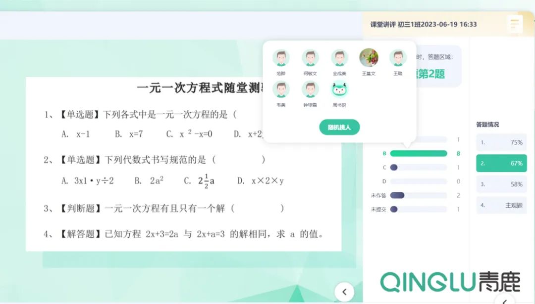 “一言堂”是傳統課堂教學中常見的一種現象,教師講、學生聽,師生缺乏互動,學生自主思考空間少,難以做到當今所提倡的“以學生為中心”的教學。而通過青鹿智慧紙筆互動課堂的隨機挑人、搶答功能,既能提高師生互動率,又能激發學生課堂興趣,是教師快速“入門”智慧課堂的好幫手。