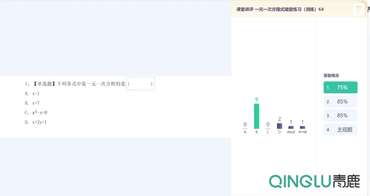 老師通過青鹿智慧紙筆系統(tǒng)一鍵下發(fā)試題,學(xué)生通過智能紙筆書寫作答,所有學(xué)生作答數(shù)據(jù)自動采集,客觀題自動批閱,正確率、學(xué)生作答分布情況自動統(tǒng)計,老師能高效又便捷地了解到每個學(xué)生的學(xué)情。