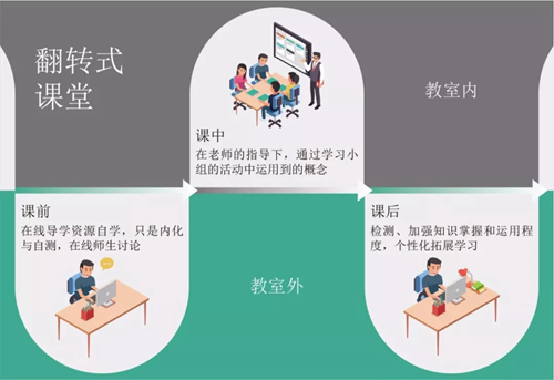 Academy)的翻轉課堂式教學,學生晚上在家自主觀看可汗學院網站的教學視頻、學習新知識,第二天回到教室做作業,遇到問題時與同學和老師討論,與傳統教學中的白天聽課、晚上做作業完全