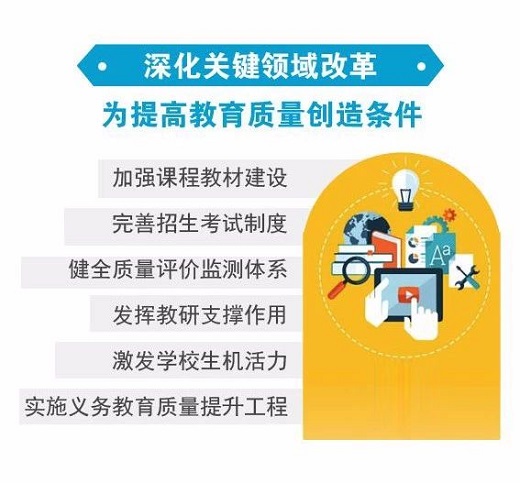 二是緊緊抓住關(guān)鍵要素。《意見》著眼于“教和學(xué)什么”,提出要堅持“五育”并舉,全面發(fā)展素質(zhì)教育,強化德育、體育、美育和勞動教育應(yīng)有地位。著眼于“怎么教和學(xué)”,從優(yōu)化教學(xué)方式、加強教學(xué)管理、完善作業(yè)考試輔導(dǎo)等方面提出具體措施,切實提高課堂教學(xué)質(zhì)量。著眼于“誰來教學(xué)生”,強調(diào)按照“四有好老師”標(biāo)準(zhǔn),建設(shè)高素質(zhì)專業(yè)化教師隊伍,同時對教育局長、校長、教研人員隊伍建設(shè)提出意見。