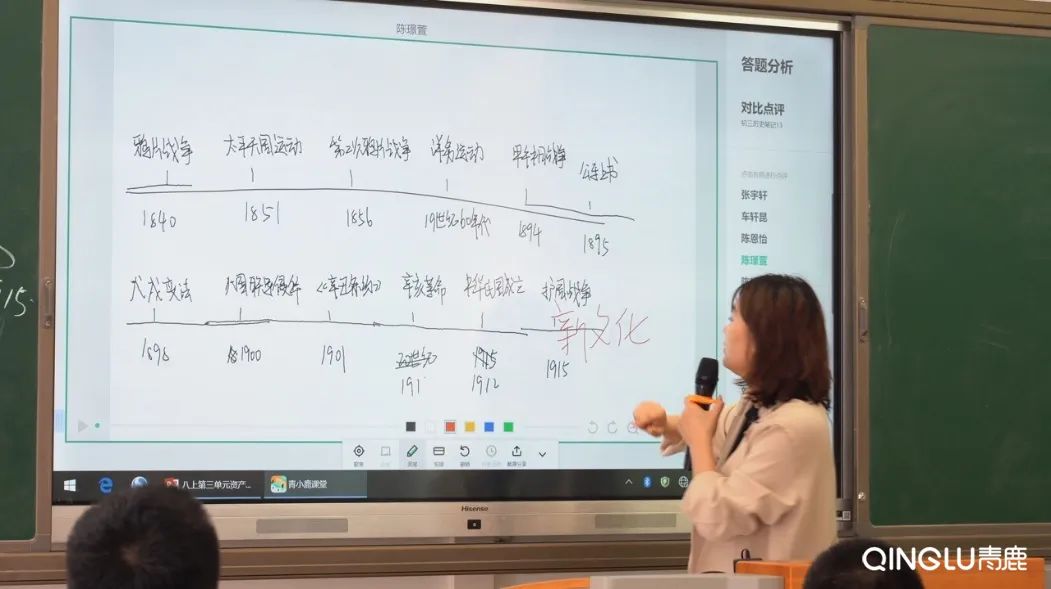 總結(jié)歸納示例:初中歷史課中,老師在引導學生總結(jié)“中國近代史”的關(guān)鍵時間線時,學生使用智能筆繪制思維導圖進行知識歸納,系統(tǒng)支持快速收集全班學生的作答內(nèi)容與展示,師生可隨機或指定選擇答案進行點評與糾錯,促進學生思維發(fā)展與總結(jié)歸納。