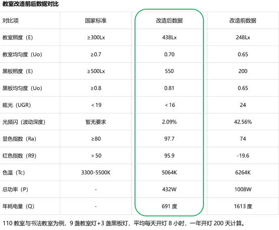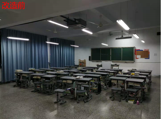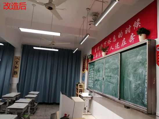 教室改造后課桌照度為311Lx,黑板照度602Lx,優于國家標準,色溫5000K,光線柔和,減少眼疲勞,保護學生視力健康;