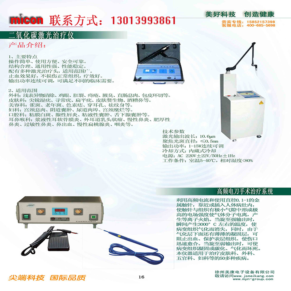 二氧化碳激光治療機(jī)是一種采用激光先進(jìn)技術(shù)產(chǎn)生局部高溫并高精度定位,利用激光光束作用于患者病處,對病變組織進(jìn)行灼燒、切割、碳化、理療等操作,具有手術(shù)簡單,創(chuàng)面小等優(yōu)點(diǎn),是各級醫(yī)院及美容院的必備設(shè)備。由于激光束有高度的方向性,有很高的密度和連貫性,它可被聚集到很小的治療部位,因而其作用部位局限于很小的范圍,不會對周圍組織和皮膚附屬器(毛囊、皮脂 腺等)造成損傷;其穿透深度可通過輸入功率來控制,只要掌握得適當(dāng),不會在局部出現(xiàn)凹疤。 二、功能特點(diǎn)