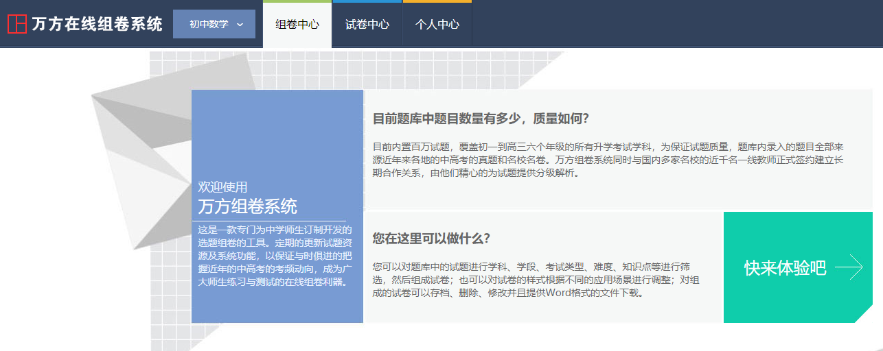 萬方在線組卷系統是一款專門為中學師生訂制開發的選題組卷的工具。目前內置百萬試題,覆蓋了初、高中六個年級的所有升學考試學科,為保證試題質量,題庫內錄入的題目全部來源近年來各地的中高考的真題和名校名卷。