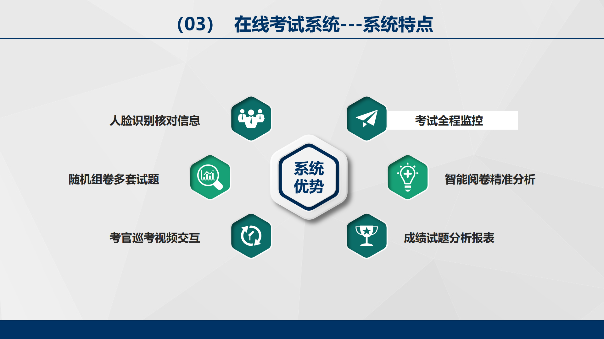 產品詳細介紹網上在線考試管理系統,由于疫情影響,學生不能及時返校,我公司根據市場需求,從市場調研到學校測試,僅僅用了20天時間,快速研發出《網上在線考試管理系統》,該系統成功用于山東省專升本校考及單招考試,并得到使用單位的一致好評。該系統主要特點是:人臉識別核對信息、考試全程監控、隨機組卷多套試題、考官巡視與考生實時交流、智能閱卷智能分析,成績生成分析報表。 |