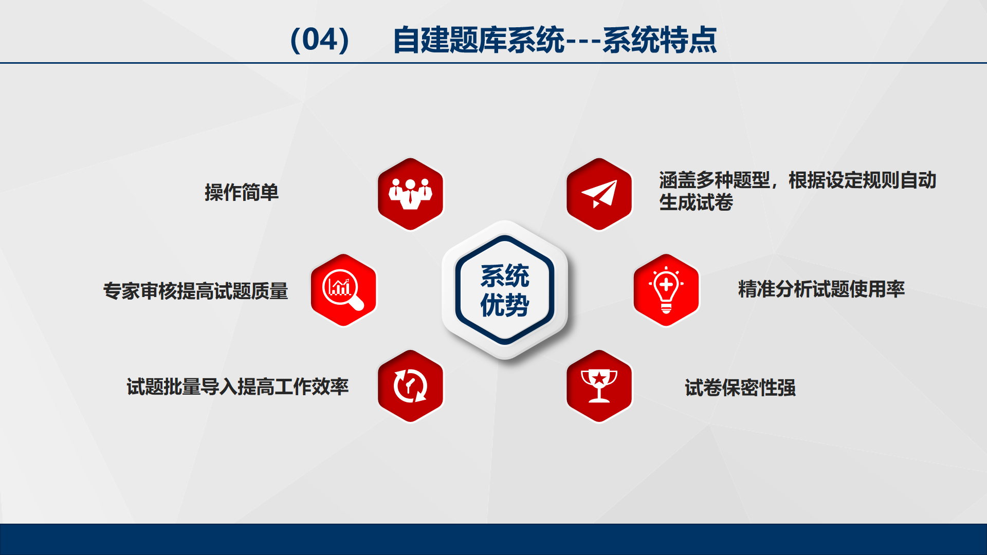 產品詳細介紹自建題庫管理系統,系統實現了教考分離,操作簡單、涵蓋多種題型,根據設定規則自動生成試卷、專家審核提高試題質量、精準分析試題使用率、試題批量導入提高工作效率、試卷保密性強。