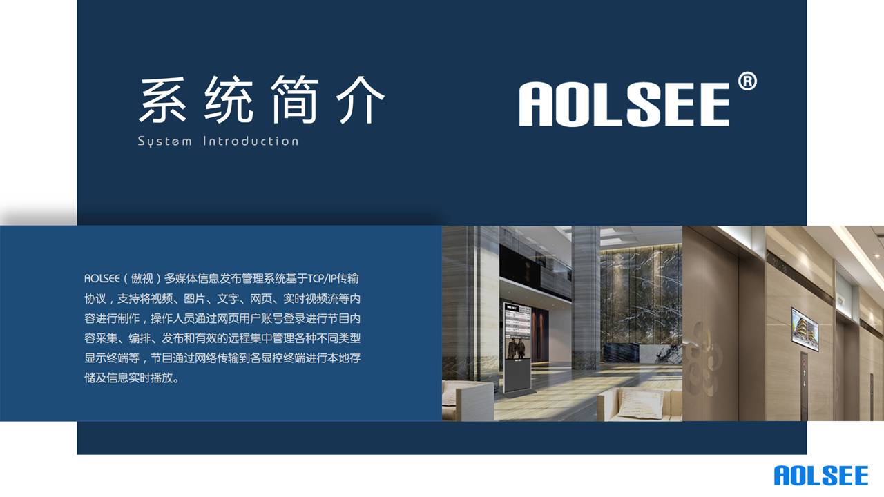 產品詳細介紹AOLSEE信息發布軟件V9.0---AOLSEE(傲視)多媒體信息發布管理系統基于TCP/IP傳輸協議,支持將視頻、圖片、文字、網頁、實時視頻流等內容進行制作,操作人員通過網頁用戶賬號登錄進行節目內容采集、編排、發布和有效的遠程集中管理各種不同類型顯示終端等,節目通過網絡傳輸到各顯控終端進行本地存儲及信息實時播放。