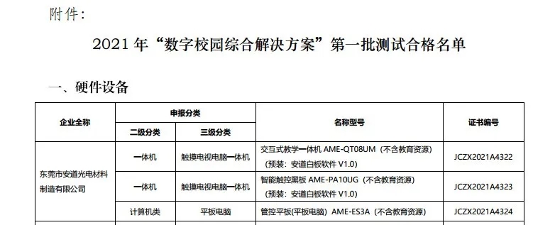 近日,由中央電化教育館公布了2021年“數字校園綜合解決方案”第一批測試合格名單,經過層層遴選,安道教育智慧教學產品再次入選中央電化教育館《數字校園綜合解決方案》。
