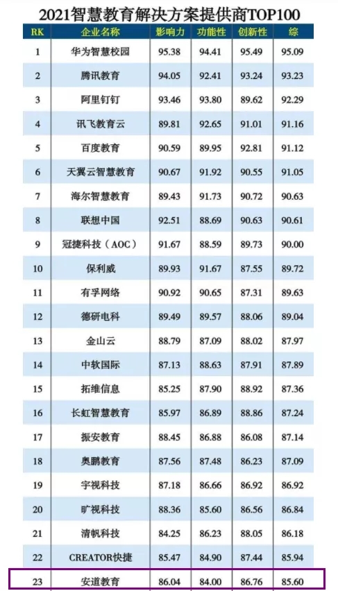 作為教育行業(yè)的設備制造商和解決方案服務商,安道教育匠心堅守16載,得到行業(yè)和客戶的認可。位列由《互聯(lián)網(wǎng)周刊》& eNet研究院發(fā)布的《2021智慧教育解決方案提供商 TOP100》排行榜TOP 23,相比去年上升了兩名。