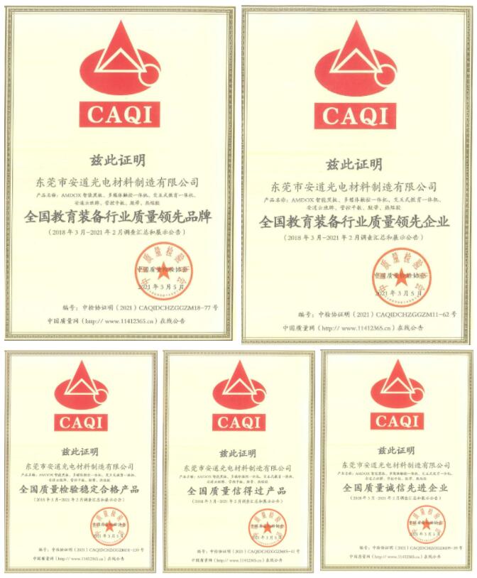 2021年,安道教育還連續(xù)斬獲“全國教育裝備行業(yè)質(zhì)量領先品牌”“全國教育裝備行業(yè)質(zhì)量領先企業(yè)”“全國質(zhì)量誠信先進企業(yè)”“全國質(zhì)量信得過產(chǎn)品”“全國質(zhì)量檢驗穩(wěn)定合格產(chǎn)品”等榮譽。