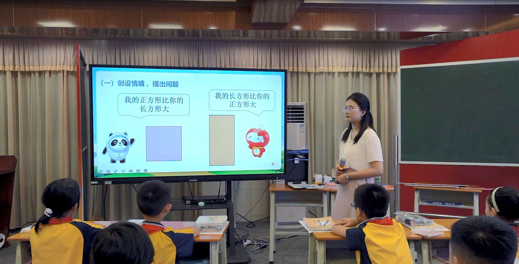 “我的正方形比你的長(zhǎng)方形大”“我的長(zhǎng)方形比你的正方形大”,教室里突然傳來(lái)了冰墩墩和雪容融的爭(zhēng)辯聲?