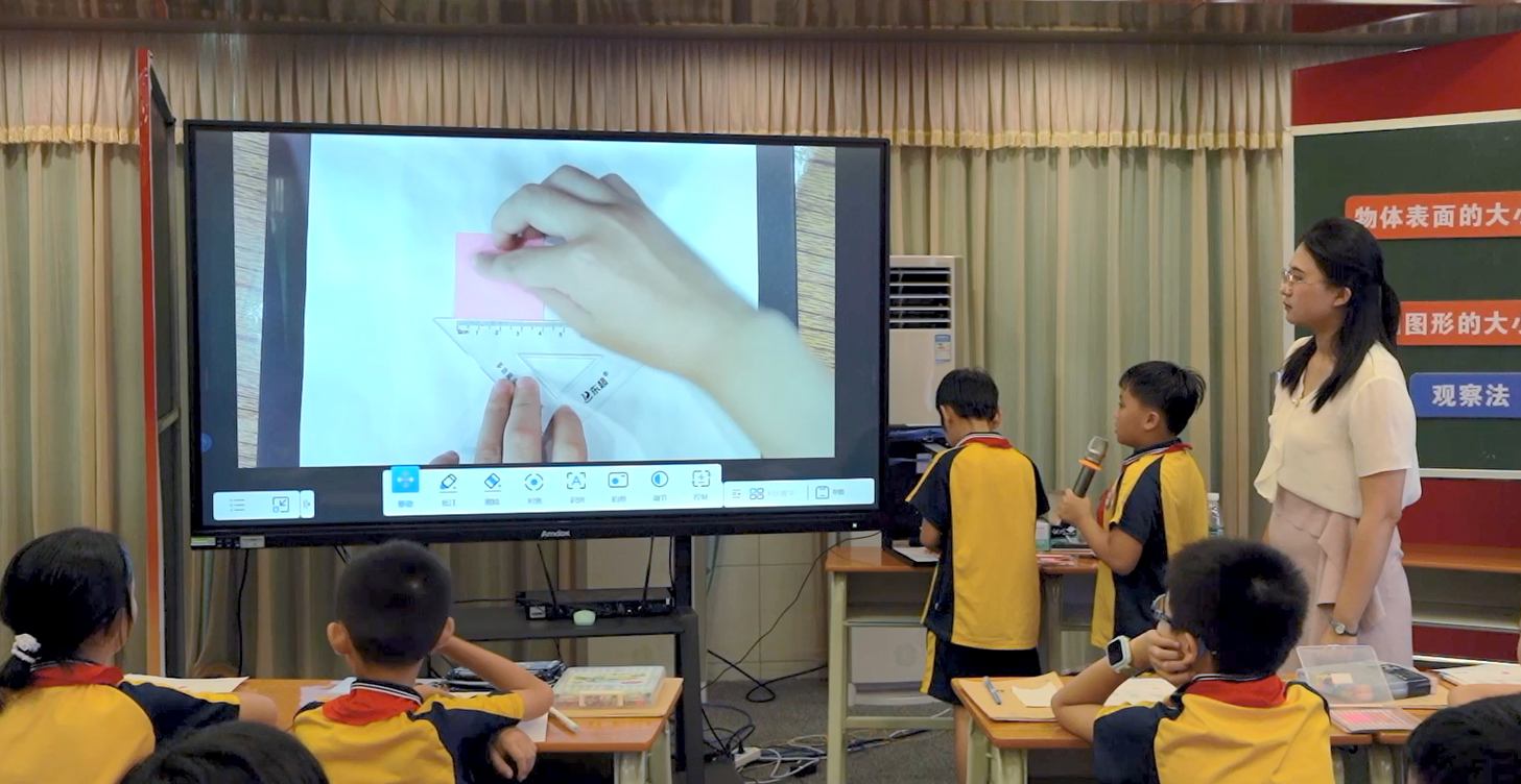“冰墩墩和雪容融都是孩子們非常熟悉的形象,通過(guò)他們爭(zhēng)辯的情景把大家?guī)У矫娣e的世界里,從聽(tīng)覺(jué)、視覺(jué)兩方面同時(shí)吸引孩子們的注意力,再引導(dǎo)他們提出面積相關(guān)的問(wèn)題,能夠有效提高課堂教學(xué)效果。”陳桃老師說(shuō)道,巧用安道智能交互教學(xué)一體機(jī),導(dǎo)入圖片、音頻創(chuàng)設(shè)主題情景,可以將枯燥、深?yuàn)W的知識(shí)場(chǎng)景化、動(dòng)態(tài)化,不僅有利于學(xué)生們集中注意力,更能有效引導(dǎo)學(xué)生循序觀(guān)察,培養(yǎng)學(xué)生思考、提出問(wèn)題的能力,提高學(xué)生的思維發(fā)展。