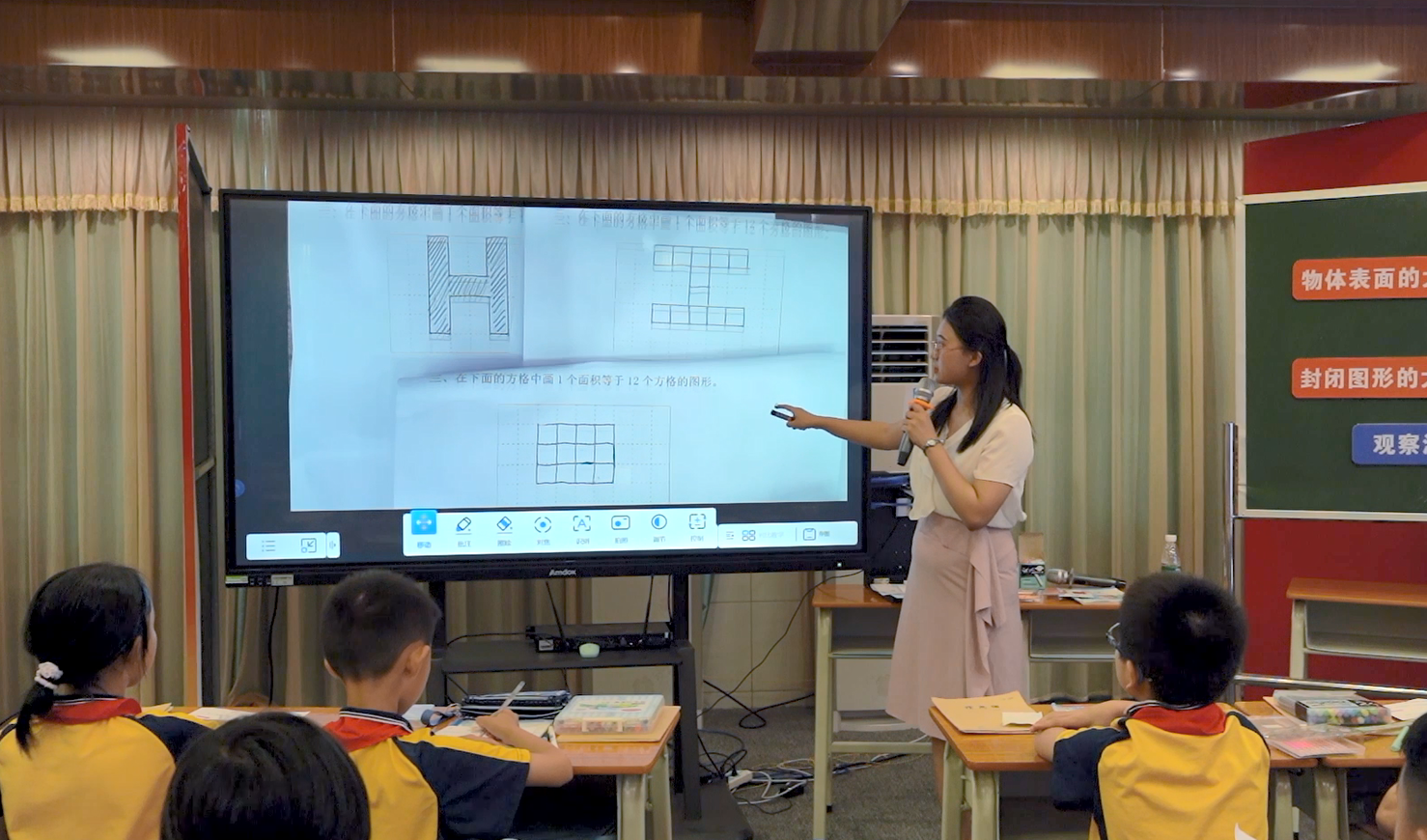 原來(lái)是吳川市城建小學(xué)陳桃老師正在給同學(xué)們上數(shù)學(xué)課——《什么是面積》。課堂上,安道智能交互教學(xué)一體機(jī)正放映著本節(jié)課的課件,所謂冰墩墩和雪容融的爭(zhēng)辯聲則是從一體機(jī)傳出來(lái)的。
