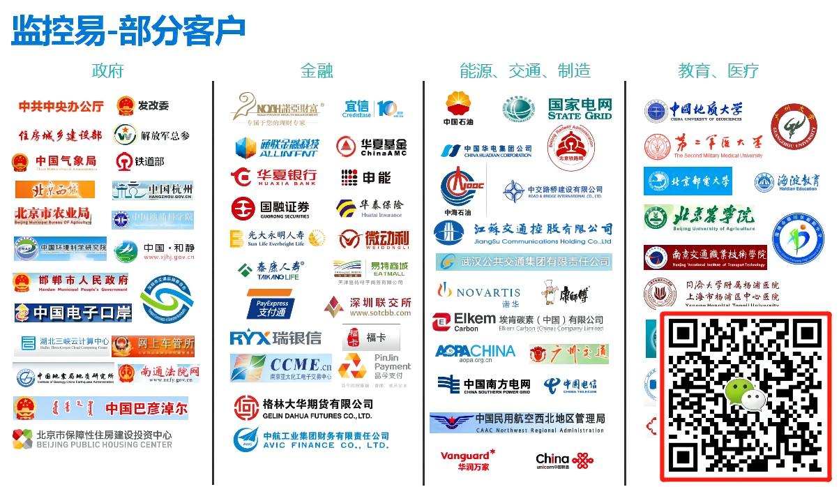 ❽【監控易】典型客戶:中共中央辦公廳、北京發改委、中國地質大學、北京郵電大學、廣州大學、開封市電教館、國家住建委、國家電網、某部、中石油、阿里巴巴智慧園區、江蘇高速、中國黃金、湖北三峽云計算中心等,目前已超過兩萬家用戶使用監控易。