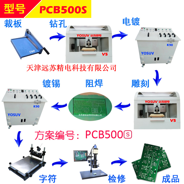 工藝目的: 裁板:將覆銅板通過(guò)精密裁板機(jī)裁成所需尺寸,一般比所需要尺寸多出來(lái)1CM邊框。 鉆孔:根據(jù)軟件提示,將PCB板上所有的孔通過(guò)雕刻機(jī)鉆出所需的孔。 孔金屬化:用過(guò)孔電鍍系統(tǒng)對(duì)PCB板上的孔進(jìn)行金屬化處理。 雕刻:用PCB雕刻機(jī)對(duì)覆銅板進(jìn)行雕刻,雕刻出所需的線路。 阻焊:用曝光機(jī)對(duì)雕刻好的PCB板進(jìn)行曝光,將曝光好的PCB板進(jìn)行綠油阻焊。 字符:用絲印機(jī)對(duì)做好阻焊的PCB板進(jìn)行字符的絲印。 板面處理:將做好的線路板進(jìn)行表面處理,便于焊接。 檢修:通過(guò)視頻檢測(cè)儀處理表面細(xì)微金屬碎屑,以便于達(dá)到最佳效果。 設(shè)備配置: (1)裁板機(jī)C60 產(chǎn)品概述: 遠(yuǎn)蘇科技是國(guó)內(nèi)頂級(jí)PCB雕刻機(jī)生產(chǎn)制造商,專注于國(guó)內(nèi)外高端企業(yè)及學(xué)校客戶的精密研發(fā)制板需求,提供用于對(duì)覆銅板進(jìn)行鉆孔、雕刻、外形銑割的線路板雕刻機(jī)及相關(guān)設(shè)備。 ________________________________________ 技術(shù)參數(shù) 最大切板尺寸 345mm 外形尺寸 480*330*180mm 重量 12kg ________________________________________ 產(chǎn)品亮點(diǎn) • 特制鋼長(zhǎng)壽命刀刃,耐用性強(qiáng),獨(dú)特的省力杠桿式設(shè)計(jì),輕松切割各種厚板材。 • 流線型的外觀符合人體工程學(xué)的設(shè)計(jì)。 • 配置水平對(duì)位功能,可以方便的切割固定形狀的PCB板。 • 最大切割長(zhǎng)度345mm,最大切板厚度3mm。 • 具有對(duì)位和固定標(biāo)尺,精度更高,使用更方便。 • 防誤傷安全裝置,固定透明保護(hù)罩,既保證不會(huì)誤傷手指,同時(shí)也可以清晰觀查切板過(guò)程及切板質(zhì)量。 ________________________________________ 產(chǎn)品用途 C60高精度裁板機(jī)主要用于PCB制板工藝過(guò)程中線路板的裁切工藝,流線型的外觀設(shè)計(jì),獨(dú)特的省力桿設(shè)計(jì)及防誤傷裝置,讓操作者能夠安全輕松的裁板。 (2) 過(guò)孔電鍍機(jī)K90 產(chǎn)品概述: 遠(yuǎn)蘇科技是國(guó)內(nèi)頂級(jí)PCB雕刻機(jī)生產(chǎn)制造商,專注于國(guó)內(nèi)外高端企業(yè)及學(xué)校客戶的精密研發(fā)制板需求,提供用于對(duì)覆銅板進(jìn)行鉆孔、雕刻、外形銑割的線路板雕刻機(jī)及相關(guān)設(shè)備。 ________________________________________ 技術(shù)參數(shù) 最大板面 300*300mm 最小孔徑 0.3mm 最大厚徑比 2.5:1 輸出電流 0-15A 工作電壓 220V/50HZ 外形尺寸 880mm(L)×600mm(W)×920mm(H) 重量 90kg ________________________________________ 產(chǎn)品亮點(diǎn) • 電鍍液微循環(huán)系統(tǒng):內(nèi)置兩套微孔發(fā)泡管和靜音氣泵使電鍍液形成微循環(huán),提高過(guò)孔電鍍的質(zhì)量。 • 電鍍件往復(fù)運(yùn)動(dòng)功能:通過(guò)調(diào)速,可控制電鍍速度。 • 環(huán)保無(wú)污染:K90采用新型環(huán)保黑孔化直接電鍍工藝,安全、可靠、高效。黑孔液不含有傳統(tǒng)的化學(xué)鍍銅成分,取消甲醛和危害生態(tài)環(huán)境的化學(xué)物質(zhì)在配方中的使用,屬于環(huán)保型產(chǎn)品。 • 操作便捷:產(chǎn)品槽體采用耐酸堿材料,恒溫裝置采用鈦加熱管,能自動(dòng)恒溫,槽體工作時(shí)間、溫度可預(yù)設(shè),操作簡(jiǎn)易方便,自動(dòng)化程度高,貫孔導(dǎo)通率100%。 • 一體化的設(shè)計(jì):使整機(jī)結(jié)構(gòu)緊湊。 • 密封式的設(shè)計(jì):保證電鍍液不受污染,保證電鍍質(zhì)量。 ________________________________________ 產(chǎn)品用途 K90過(guò)孔電鍍機(jī),又稱孔化機(jī),鍍銅機(jī),在PCB物理快速制板工藝中主要用于對(duì)線路板上的孔進(jìn)行金屬化處理。較常用于雙面板線路板的貫孔沉銅工藝。將完成鉆孔的覆銅板置于本機(jī)中,設(shè)置好相關(guān)參數(shù),即可輕松快速的完成金屬孔化工藝,機(jī)器帶有加熱,鼓氣及電鍍功能。 (3)線路板雕刻機(jī)V5 產(chǎn)品概述: 遠(yuǎn)蘇科技是國(guó)內(nèi)頂級(jí)PCB雕刻機(jī)生產(chǎn)制造商,專注于國(guó)內(nèi)外高端企業(yè)及學(xué)校客戶的精密研發(fā)制板需求,提供用于對(duì)覆銅板進(jìn)行鉆孔、雕刻、外形銑割的線路板雕刻機(jī)及相關(guān)設(shè)備。 ________________________________________ 技術(shù)參數(shù) 加工范圍 雙面板/單面板 加工面積 305×305mm 最小加工線徑 3mil(0.075mm) 最小加工線距 5mil(0.127mm) 分辨率 0.03mil(0.75um) 工作速度 6m/min 主軸轉(zhuǎn)速 0~60000r/min,無(wú)級(jí)調(diào)速,軟件自動(dòng)優(yōu)化轉(zhuǎn)速 主軸功率 92W 直線導(dǎo)軌 進(jìn)口直線導(dǎo)軌 傳動(dòng)方式 進(jìn)口滾珠絲桿 鉆孔孔徑 0.3~3.175MM 鉆孔深度 0.02-3.5mm 鉆孔速度 150(孔/min) 控制方式 電腦控制 通信方式 RS-232/USB 操作系統(tǒng) Windons 98/2000/XP/Vista/7/10 最小內(nèi)存配置 256MB 體積 750mm(L)×660mm(W)×660mm(H) 重量 110kg 消耗功率 250 W 電源 220V/50HZ 支持軟件 支持Protel99se、DXP、Altium Designer、Eagle、Pads、Proteus、CAD等常用EDA軟件(支持所有pcb及gerber格式的文件) ________________________________________ 產(chǎn)品亮點(diǎn) 自動(dòng)原點(diǎn)定位:可以從任意位置自動(dòng)回到設(shè)定的零點(diǎn),擁有原點(diǎn)記憶功能。 雙面板自動(dòng)定位技術(shù):保證了定位的精確性與正確性。 斷點(diǎn)續(xù)雕: