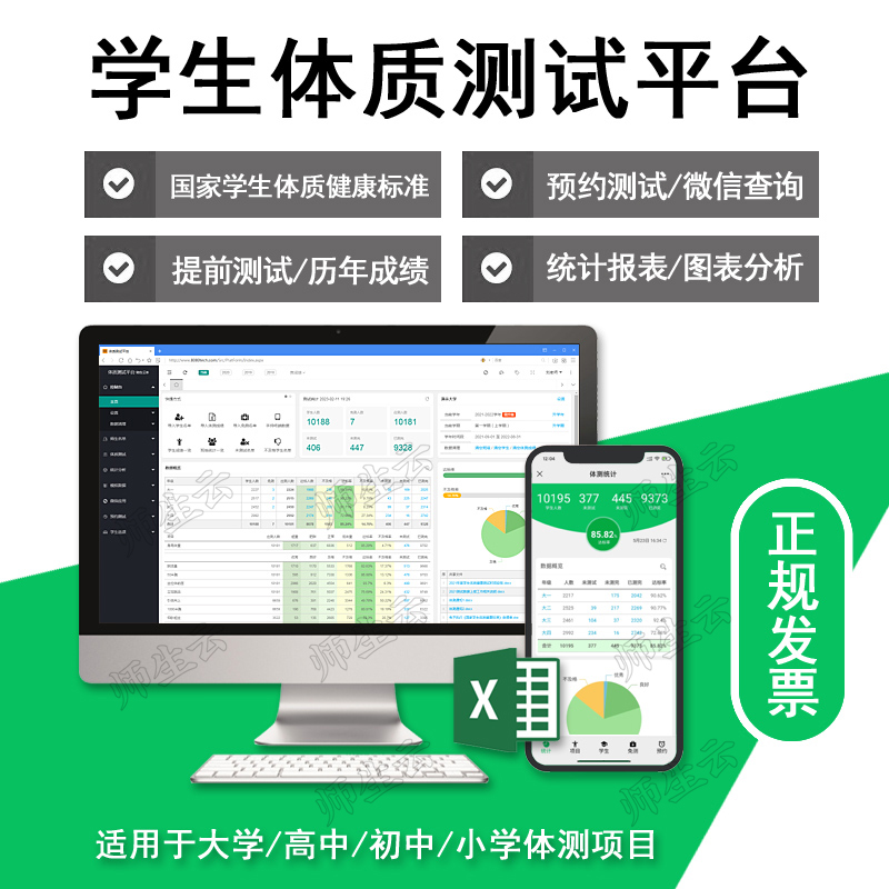 ①學生成績管理 學生成績一覽(可按院系/班級/學年/測試狀態篩選) 行政班統計一覽(可按院系/專業/學年篩選) 體育班統計一覽(可按體育班/教師/學年/測試狀態篩選) 成績等級一覽(可按優良中差等級及院系/學年/測試狀態篩選) ②免予測試管理 免測名單管理(審核通過/駁回/清空) 批量添加名單、批量審核處理(可微信推送通知) 導入/導出免測名單Excel ③數據導入/導出 導入/導出體測數據Excel(可按行政班/體育班;可按單項/合并項導入) 接收手持機實時傳輸數據 可接收測試儀實時傳輸數據 導入手持機數據 ④數據統計分析 當前數據概覽(測試人數統計、各測試項目的達標人數統計等) 按測試項目統計(可按院系/專業/學年篩選) 按年級統計(可按院系/專業/學年篩選) 按院系、專業、行政班、體育班統計) 圖形分析-達標率占比分析(可按院系/專業/學年篩選) 圖形分析-各年級對比分析(可按院系/專業/學年篩選) 圖形分析-測試項目分析(可按院系/專業/學年篩選) 圖形分析-歷年對比分析(可按院系/專業/學年篩選) ⑤數據上報 篩查身份證異常 學校測試環境設置 生成上報文件Excel(剔除未測試/免測等不符合上報的部分) ⑥學生端 體測成績查詢(含歷年體測成績) 運動處方 免予測試申請(可上傳照片、審核前二次編輯/撤消) 預約測試申請 體育選課 修改密碼、修改頭像、找回密碼