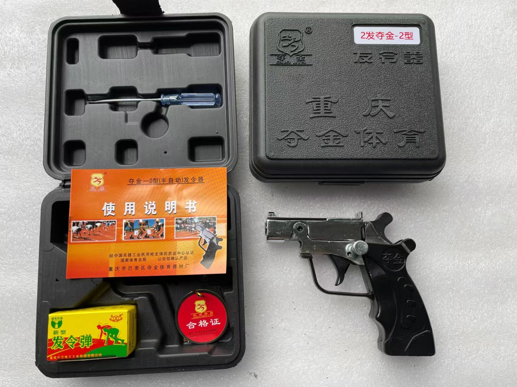 產品詳細介紹規格參數 發令器:主要材質為生鋁,槍身和槍管一體制造,其中槍 管為實心,不能發射任何彈丸,塑膠手柄;容彈器:有裝彈2發、 6 發兩種型號;激發方式:單發激發;使用 5.6mm 定裝發令彈。 發令彈:發火可靠、使用安全、煙霧明顯、音響適中;鋼 制材料、直徑5.6mm,長度:12mm,100發裝一盒,比武競賽專用.