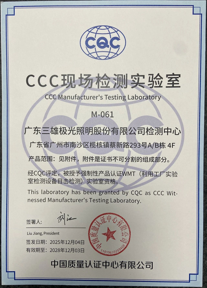 站在新的起點上,三雄極光檢測中心將充分發揮CCC現場檢測實驗室的技術優勢,持續筑牢產品安全與質量防線,以更高標準、更優品質的照明產品,滿足市場與消費者的多元化需求,同時為照明行業的高質量、規范化發展貢獻三雄力量。
