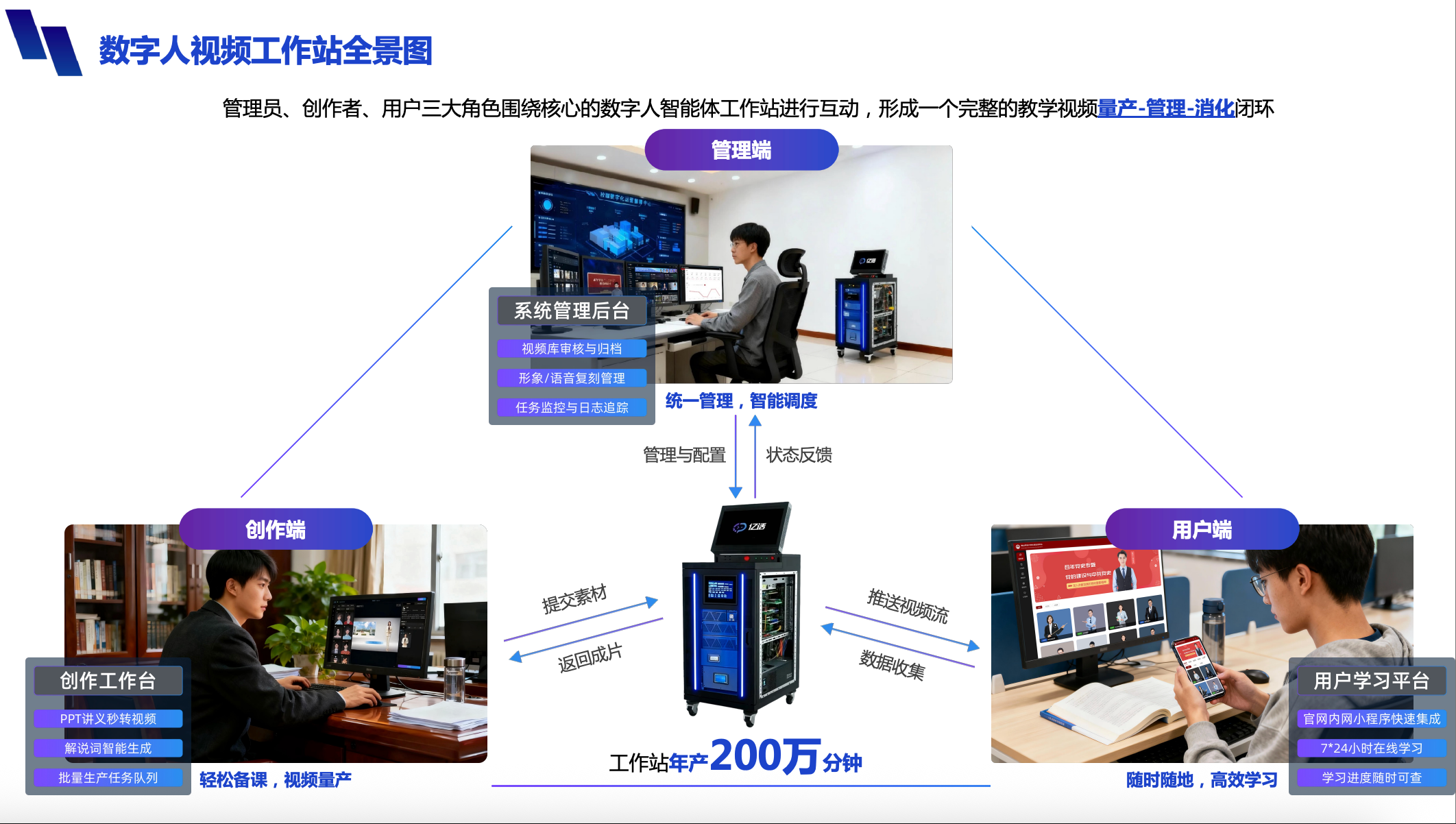 產品詳細介紹“億話-數字人智能體工作站全棧解決方案”是八點八數字科技面向高校推出的教育數字化一體化平臺,深度融合大模型、數字人技術與智能體應用,致力于為教師減負、為教學增效、為校園賦能。該方案支持**一鍵批量生成高質量微課視頻**,將傳統數日的課件制作流程壓縮至數小時,助力教師高效構建校本資源庫;同時提供**真人級形象與聲音復刻**,打造親切可信的“數字教師”,實現7×24小時智能交互與精準答疑。系統覆蓋教學、管理、宣傳、服務四大核心場景,可靈活嵌入學校官網、小程序、校園APP等多終端,并支持全棧本地化部署,確保數據安全與合規。目前已在華南理工大學、電子科技大學、華東師范大學等多所高校成功落地,正成為推動高校教育數字化轉型、構建智慧校園新生態的關鍵基礎設施。