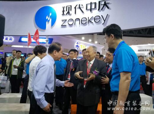 作為人工智能錄播的首創企業,現代中慶攜人工智能和大數據技術與課堂教學應用相融合的解決方案——中慶智課強勢來襲,時尚外觀的產品,全面成熟的體驗,吸引眾多參展嘉賓在中慶展臺駐足。教育部總督學柳斌先生蒞臨展位,考察中慶智能教育的最新成果,中慶集團董事長宋東茂及總經理周少林為其詳細講解中慶智課,柳先生對中慶的技術表示高度肯定并提出了許多寶貴建議。