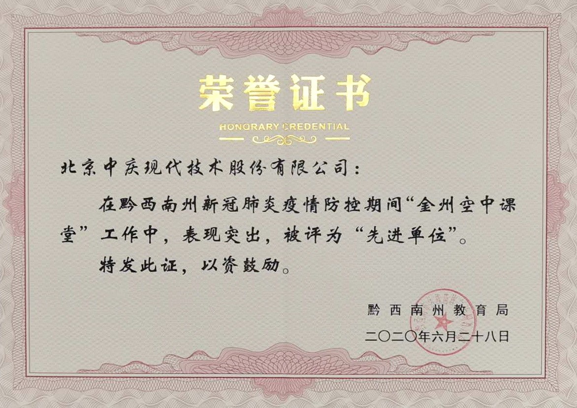 近日,貴州黔西南州教育局對“金州空中課堂”工作中有突出表現的先進單位和個人進行了表彰,現代中慶優質的服務得到教育局的認可,與25個市縣教育局和學校單位一起榮獲先進單位稱號。