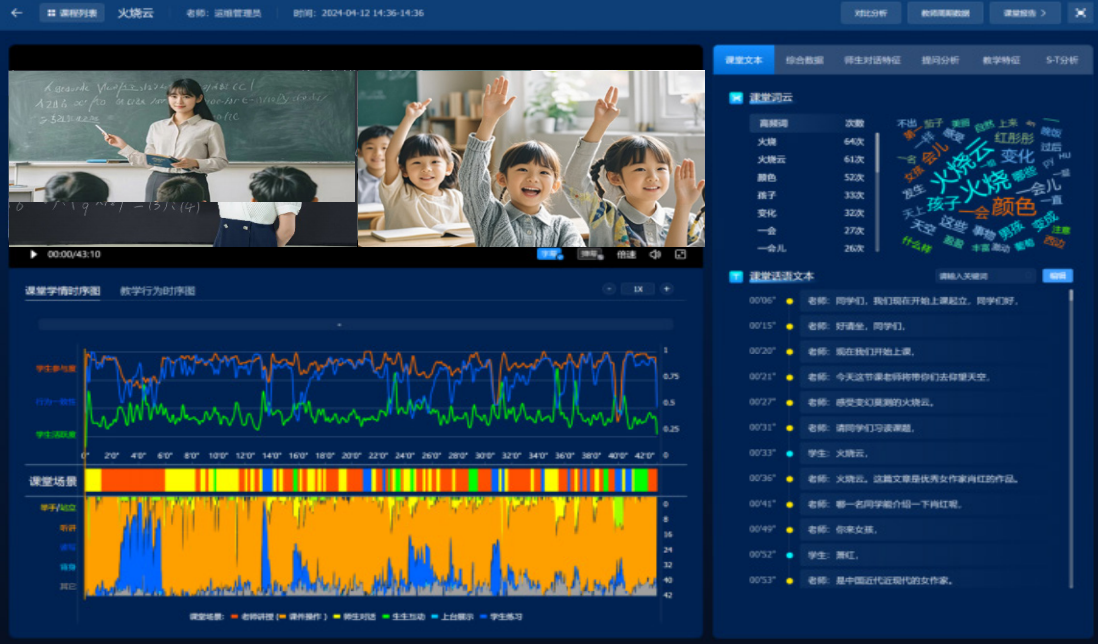 現代中慶AI精準教研系統,對課堂教學中師生的教學行為數據進行采集,自動生成七個維度的學情數據分析,包括課堂場景分布、師生教學行為分布、師生對話時長分析、老師教學特征、學生應答分析、學生活躍度分析、S-T教學模式分析等。