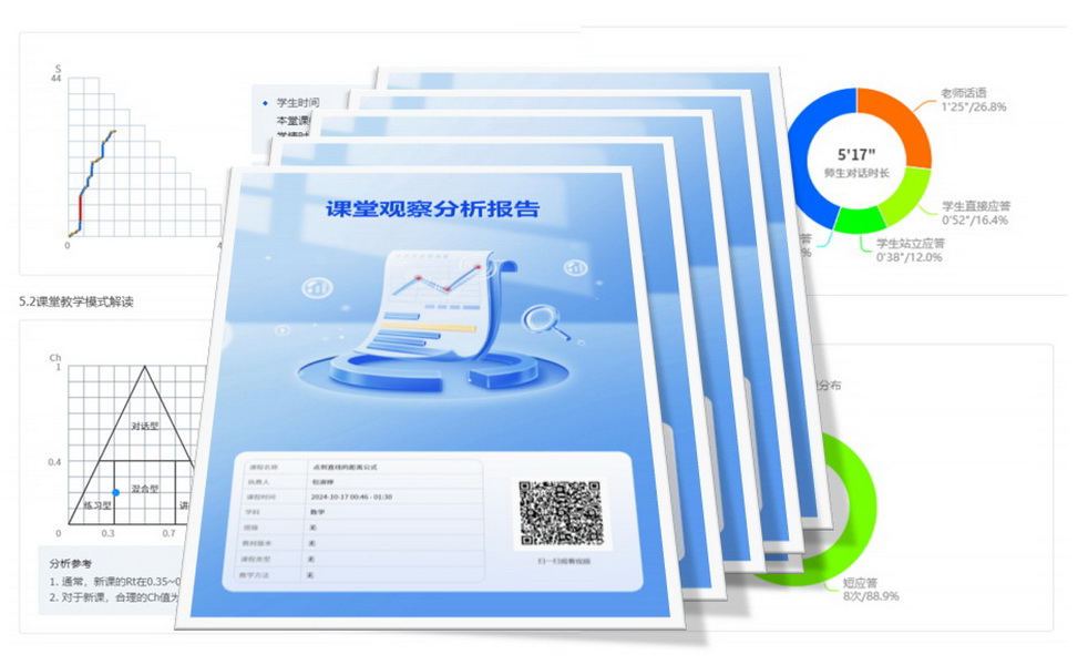 現(xiàn)代中慶為各展示課提供了AI課堂數(shù)據(jù)分析報(bào)告。報(bào)告基于現(xiàn)場采集的師生教學(xué)行為和語音數(shù)據(jù),給出課堂學(xué)情、課堂場景、師生行為、提問等等諸多維度實(shí)證化的教學(xué)反饋,讓授課教師能夠迅速掌握,幫助教師精準(zhǔn)改進(jìn)教學(xué),提升教學(xué)質(zhì)量。