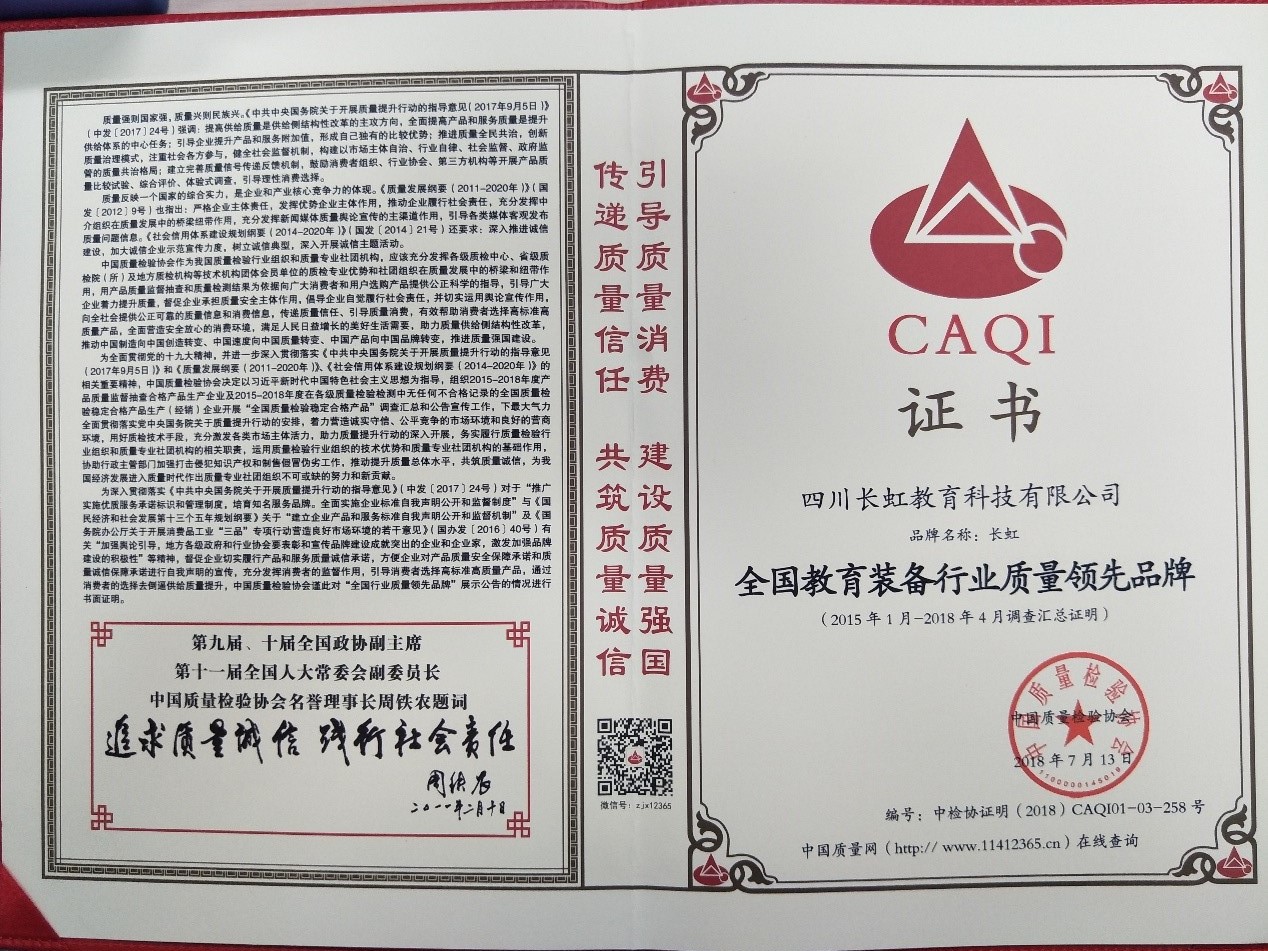 長虹教育公司自成立至今始終秉承工匠精神,堅持生產(chǎn)、銷售高質(zhì)量教育裝備產(chǎn)品,因此長虹教育的產(chǎn)品質(zhì)量多次獲得權(quán)威機構(gòu)和市場消費者的認可,這樣的榮譽充分體現(xiàn)了長虹教育產(chǎn)品質(zhì)量始終保持全國領(lǐng)先地位。