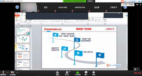2月8日上午8點,客戶沒有視頻系統,長虹教育立即遠程為用戶安裝了自用的網絡會議系統。隨即,展開了一堂豐富有內容的客戶培訓課程,三位講師分別從“商務溝通技巧”、“長虹教育產品基礎知識及操作方法”、“銷售案例分析”等三個課題主題開始了在線互動培訓。