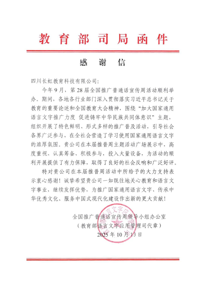 昨日,全國推廣普通話宣傳周領導小組辦公室(教育部語言文字應用管理司)向長虹教育科技發來感謝信,對公司在第28屆全國推廣普通話宣傳周活動中的支持表示衷心感謝。