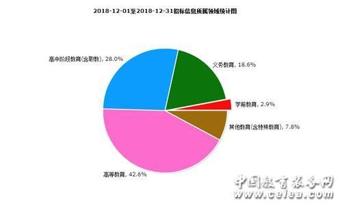 從12月招標采購信息所屬領域統計圖(如圖6所示)上看,學前教育占比為2.9%;義務教育占比為18.6%;高中階段教育(含職教)占比為28.0%;高等教育占比為42.6%;其他教育(含特殊教育)占比為7.8%。