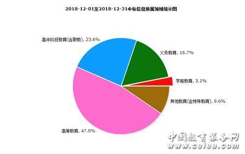 12月中標信息所屬領域統計圖,如圖10所示:學前教育占比為3.1%;義務教育占比為16.7%;高中階段教育(含職教)占比為23.6%;高等教育占比為47.0%;其他教育(含特殊教育)占比為9.6%。