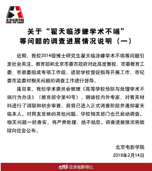 翟天臨發布致歉信:接受北京電影學院作出的一切決定;申請退出北京大學博士后流動站的相關工作。