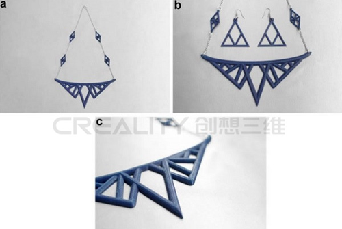 珠寶吊墜設計1(藍色PLA長絲)。 b珠寶吊墜設計1,配有耳環。 c Zoomed觀點的珠寶吊墜設計1