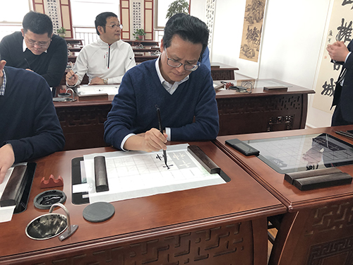 領導們仔細觀看了產品演示,并饒有興趣地親自體驗使用翰和智慧書法標準教室,同時得到深刻的體會與感悟。