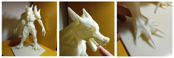 1、動漫手辦:3D打印狼人模型,湖南大學(xué)生畢業(yè)設(shè)計作品。該模型以0.1mm層厚打印耗時約20h左右,而最終成品精細(xì)度遠(yuǎn)超過預(yù)期,牙齒、爪尖等細(xì)節(jié)表現(xiàn)尤為精細(xì)。